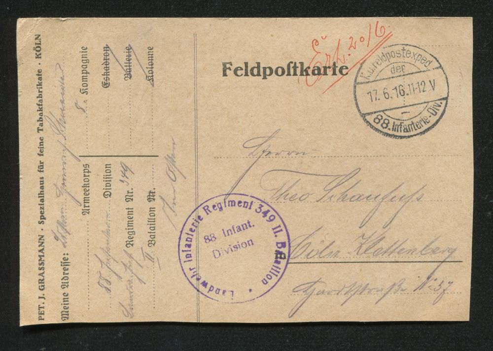 Ein Onlinearchiv mit Feldpostkarten und Liebesgaben aus dem ersten Weltkrieg des 20. Jahrhunderts. Unser Verein „Kölsche Funke rut-wieß vun 1823 e.V.“ oder kurz die „Roten Funken“ gedenken hier Mitgliedern, die den grausamen Krieg erleben mussten.