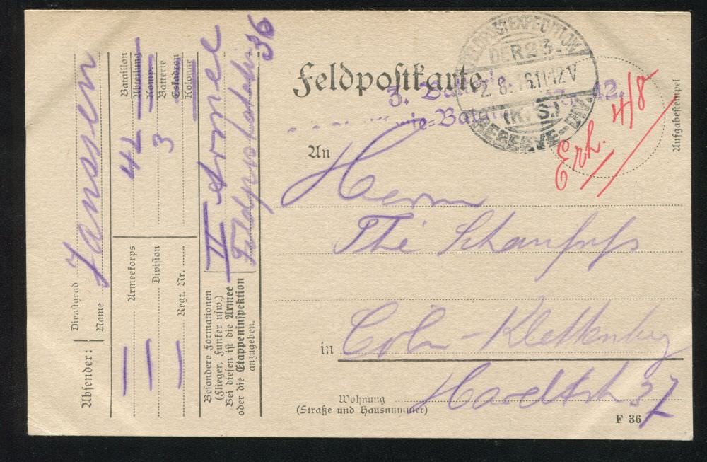 Ein Onlinearchiv mit Feldpostkarten und Liebesgaben aus dem ersten Weltkrieg des 20. Jahrhunderts. Unser Verein „Kölsche Funke rut-wieß vun 1823 e.V.“ oder kurz die „Roten Funken“ gedenken hier Mitgliedern, die den grausamen Krieg erleben mussten.
