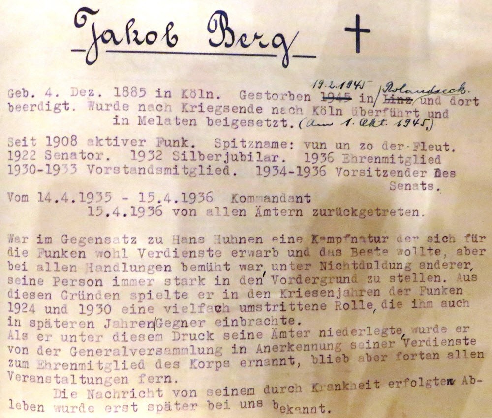 (1) RF-Stammrollen, (2) HSTAD NW 1079 Nr. 3253, (3) Der Neue Tag vom 24.01.1936, (4) RF Vor, Protokoll über die Vorstandssitzung vom 13.11.1930, (5) RF Vor, Protokoll über die Vorstandssitzung vom 23. Juni 1931, (6) RF Prot., Protokoll über die Vorstandssitzung am 7. September 1933, (/) RF Prot. Brief Jakob Berg an den Vorstand der Roten Funken, Köln, den 20. März 1936 sowie Brief Vorstand der Rote Funken an Jakob Berg, Köln, den 3. April 1936. (8) RF Prot, Bericht über die ausserordentliche Hauptversammlung am 25. August 1935 im Neumarktbräu. (9) RF Chronik 1943-1945, Zum Tode von Jakob Berg, (10) RF Chronik Bd. 1, Programm des 1. Damen-Komitee. (11) RF-Chronik, Bd. 6, Zum Tode von Jakob Berg