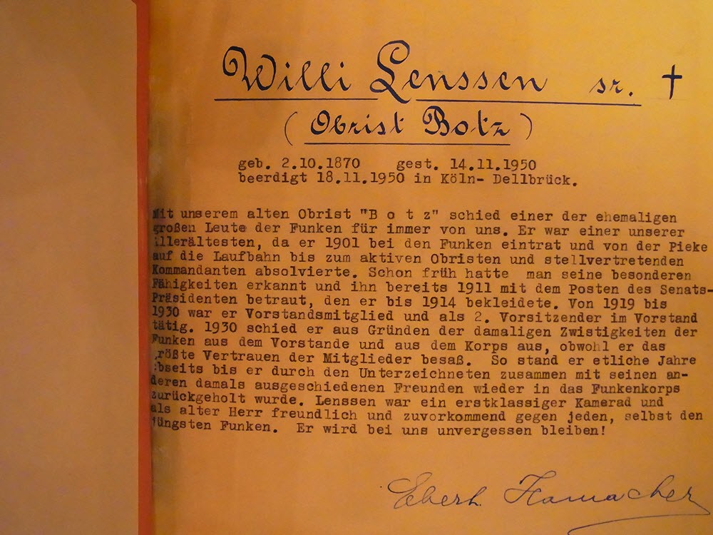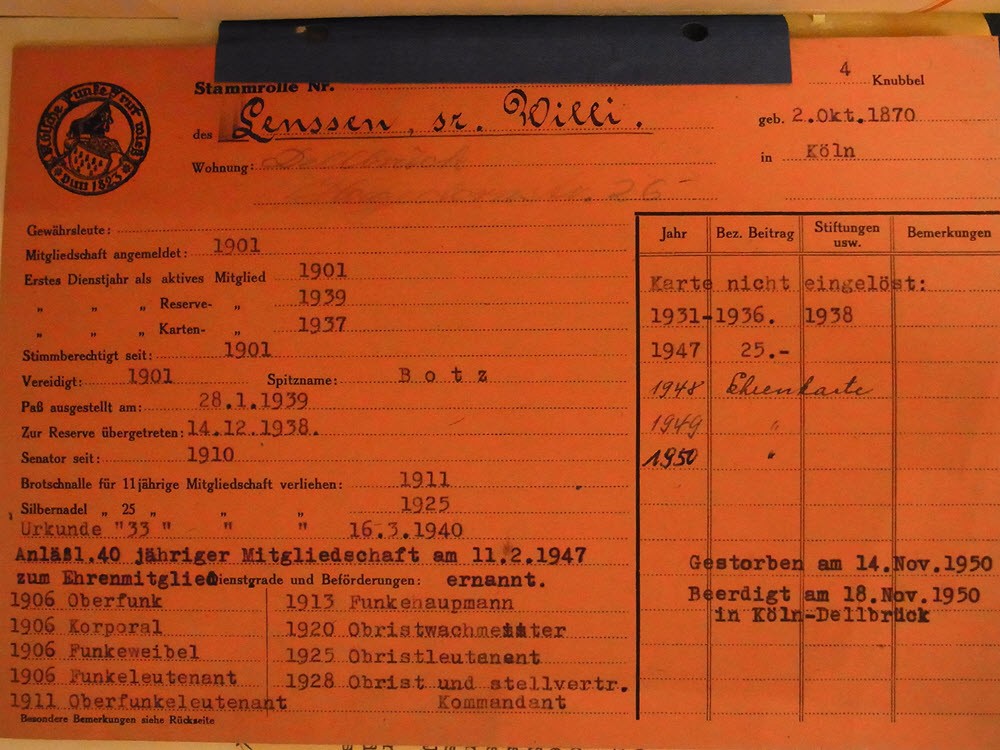 (1) RF-Stammrollen, (2) Adressbuch Köln, (3) Ulrepforte, Gedenkraum, (4) Vereinschronik, Bd. 9, Zum Tode von Willi Lenssen