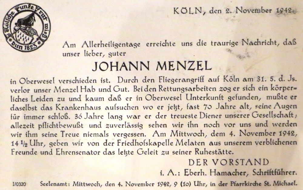 (2) Rechnungsheft der Roten Funken, Im Felde u, in Garnisonen stehende Mitglieder, (3) RF-Chronik, Bd. 6, Zum Tode von Johann Menzel