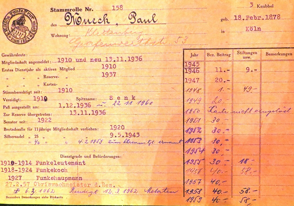 (1) RF-Stammrollen, (2) Adressbuch Köln, (3) Rechnungsheft der Roten Funken, Im Felde u, in Garnisonen stehende Mitglieder, (4) Archiv RF, Akte 127, Unseren Toten zum Gedenken