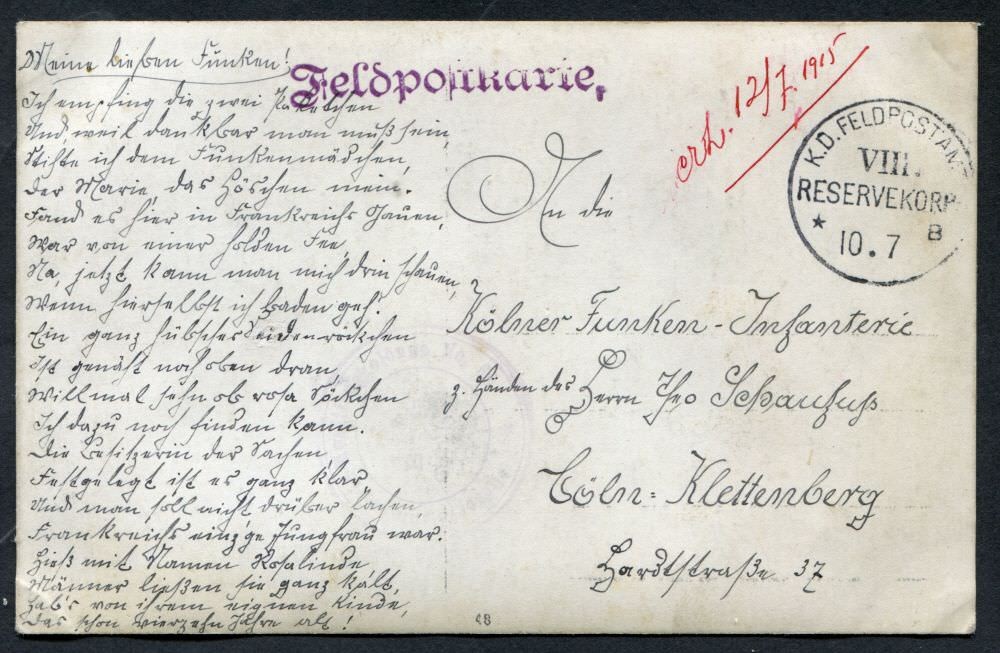 Ein Onlinearchiv mit Feldpostkarten und Liebesgaben aus dem ersten Weltkrieg des 20. Jahrhunderts. Unser Verein „Kölsche Funke rut-wieß vun 1823 e.V.“ oder kurz die „Roten Funken“ gedenken hier Mitgliedern, die den grausamen Krieg erleben mussten.