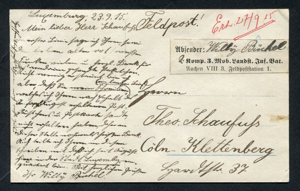 Ein Onlinearchiv mit Feldpostkarten und Liebesgaben aus dem ersten Weltkrieg des 20. Jahrhunderts. Unser Verein „Kölsche Funke rut-wieß vun 1823 e.V.“ oder kurz die „Roten Funken“ gedenken hier Mitgliedern, die den grausamen Krieg erleben mussten.