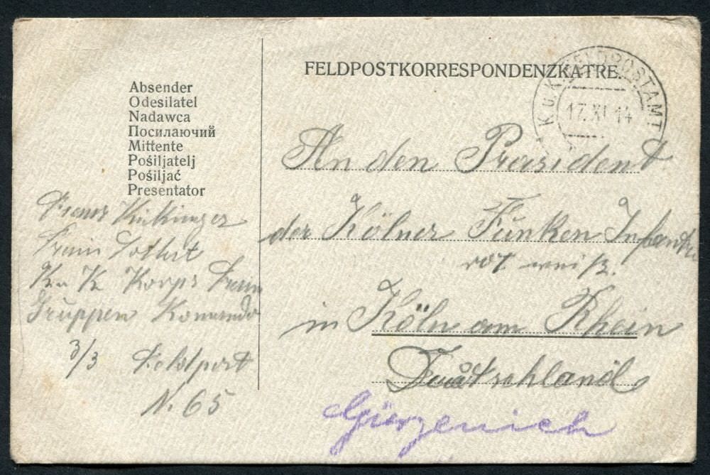 Ein Onlinearchiv mit Feldpostkarten und Liebesgaben aus dem ersten Weltkrieg des 20. Jahrhunderts. Unser Verein „Kölsche Funke rut-wieß vun 1823 e.V.“ oder kurz die „Roten Funken“ gedenken hier Mitgliedern, die den grausamen Krieg erleben mussten.