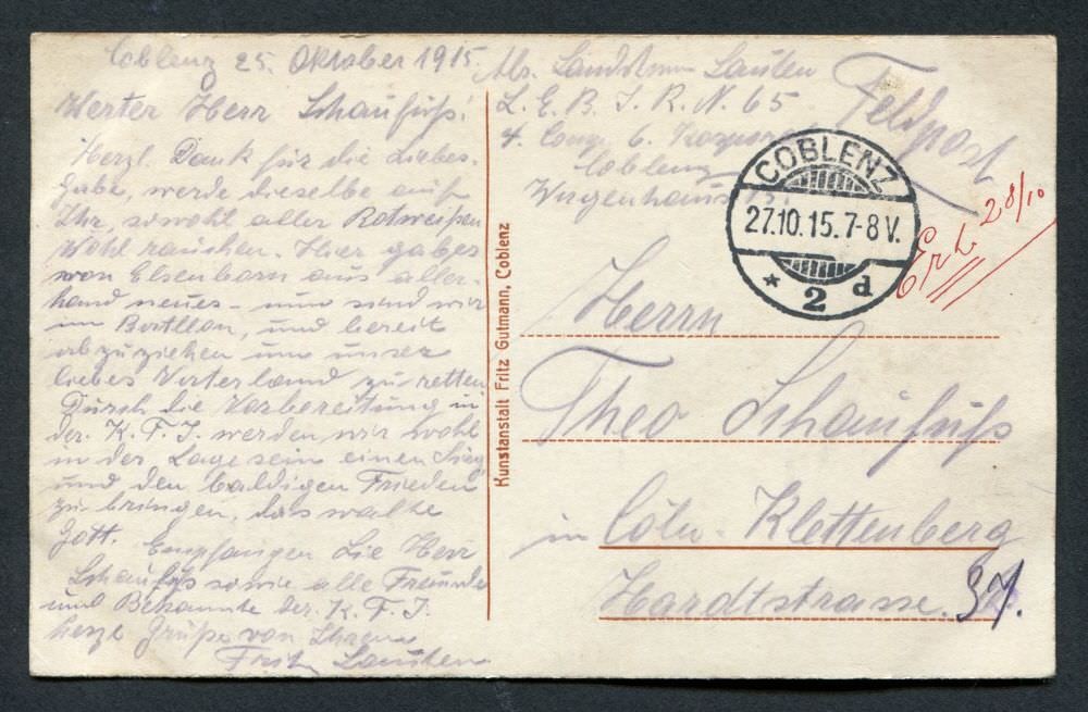 Ein Onlinearchiv mit Feldpostkarten und Liebesgaben aus dem ersten Weltkrieg des 20. Jahrhunderts. Unser Verein „Kölsche Funke rut-wieß vun 1823 e.V.“ oder kurz die „Roten Funken“ gedenken hier Mitgliedern, die den grausamen Krieg erleben mussten.