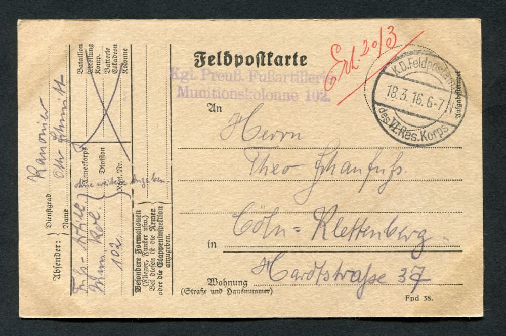 Ein Onlinearchiv mit Feldpostkarten und Liebesgaben aus dem ersten Weltkrieg des 20. Jahrhunderts. Unser Verein „Kölsche Funke rut-wieß vun 1823 e.V.“ oder kurz die „Roten Funken“ gedenken hier Mitgliedern, die den grausamen Krieg erleben mussten.