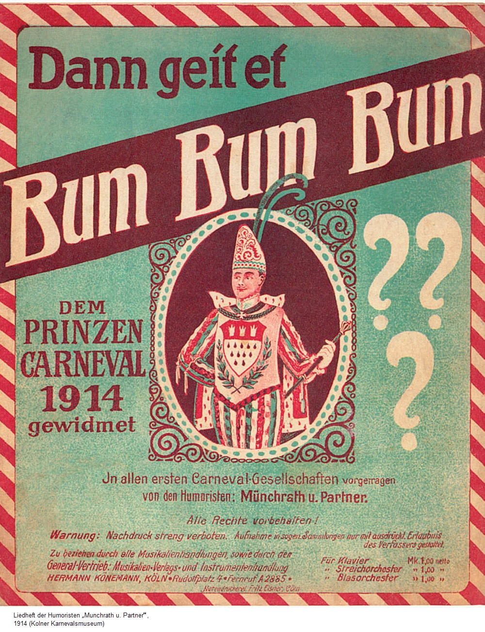 Die Kölner Humoristen „Münchrath u. Partner“ widmeten Anfang 1914 ihr Musikstück mit dem Titel „Dann geit et Bum Bum Bum“ dem Prinzen Carneval, Fritz Herrmann.1 Bereits in Friedenszeiten dichteten die Humoristen im Sinne der allgemein vorherrschenden kriegerischen Rhetorik, ohne sich der Brisanz des tatsächlich bevorstehenden Krieges bewusst zu sein. Atmosphärisch glich dies einer Vorkriegspsychose, in der sich auch der Kölner Karneval als Spiegelbild seiner Zeit auflud. Konsequent sangen die Karnevalisten 1913 mit dem Liederheft in der Hand voller Inbrunst und Überzeugung in den Sitzungen: „[…] Mit kühnem Mut und blankem Schwert. Ob rings des Krieges Fackel loht […] Es braust der Ruf der Narrenschar: Heil, Kaiser, dir, zum neuen Jahr […]“2. Die „Kölner Bürgerwehr-Bürgergarde von 1883“ ging gar mit „Lustigen Kriegs-Gesängen“ und „Feldgeschrei“ schon in die 1913er-Session: „Frau, bräng mer mi Gewehr, Zabel un Patrontäsch her, […]“.