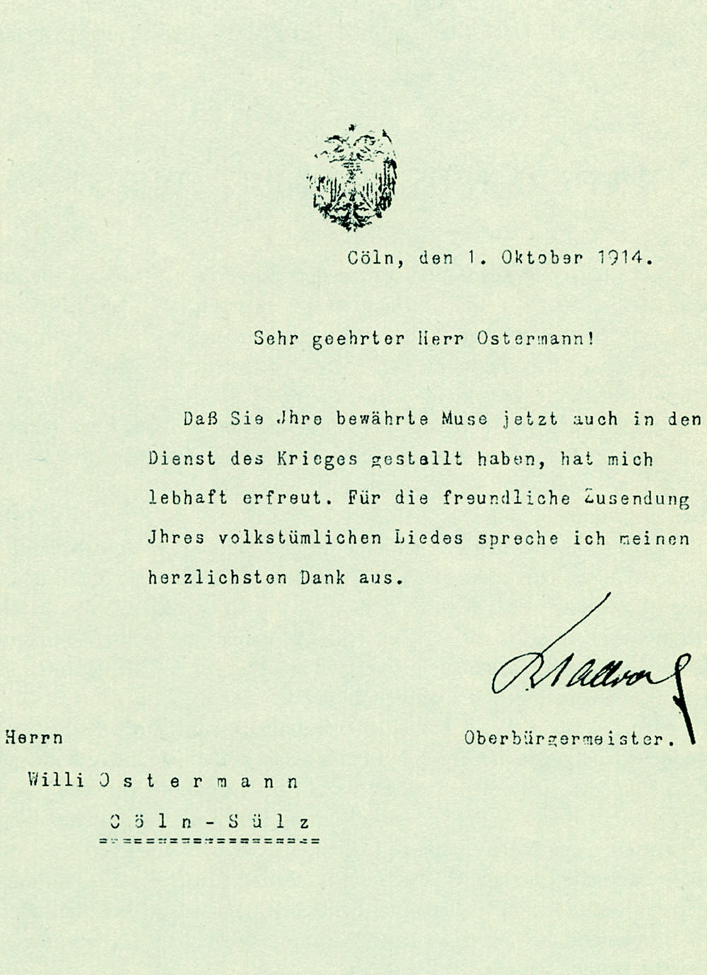 Ostermann schuf mit seinen Gedichten eine perfide Melange zwischen anrührendem Gefühl und kriegerischem Pathos. „En kölsche Mutter“ ließ er „am Mobilmachungstag, August 1914“ sagen: „Loß kumme wie et och jetz kumme mag, D`r Hergott hät gesorg, dä sorg jetz och, Kopp huh! `tschüß leeve Jung – beß noh dä Dag.“ Nach der Bombardierung Antwerpens durch einen in Köln stationierten Zeppelin am 25. August 1914 erklärte Ostermann: „Su eß et räch, nur öndentlich-Vun bovve dren geschmesse, Dat fremde Volk, dat fremde Pack, Zovill hät om Gewisse […]“ Oder nach der Gefangennahme russischer Soldaten: „Beß jetzt han Kammerjäger-För Russe sich bewäht, Die sollen se vertilge, Mie sin se doch nit wäht.“15 Das letzte der vierzehn Ostermann‘schen „Kriegsgedichte“ war das „Kölsch Zaldate-Leed“. Von diesem Lied war der damalige Kölner Oberbürgermeister Max Wallraf regelrecht begeistert. Sein Rathausbote Franz Matthes überbrachte deshalb das Dankesschreiben mit Datum 1. Oktober 1914 aus dem Rathaus zur Adresse Zülpicher Straße 290, II. Stock. Doch als der Bote den Brief am Freitag, den 2. Oktober zustellte, war der erhoffte schnelle Triumph über den „Erbfeind“ Frankreich in der Marne-Schlacht schon verspielt worden.