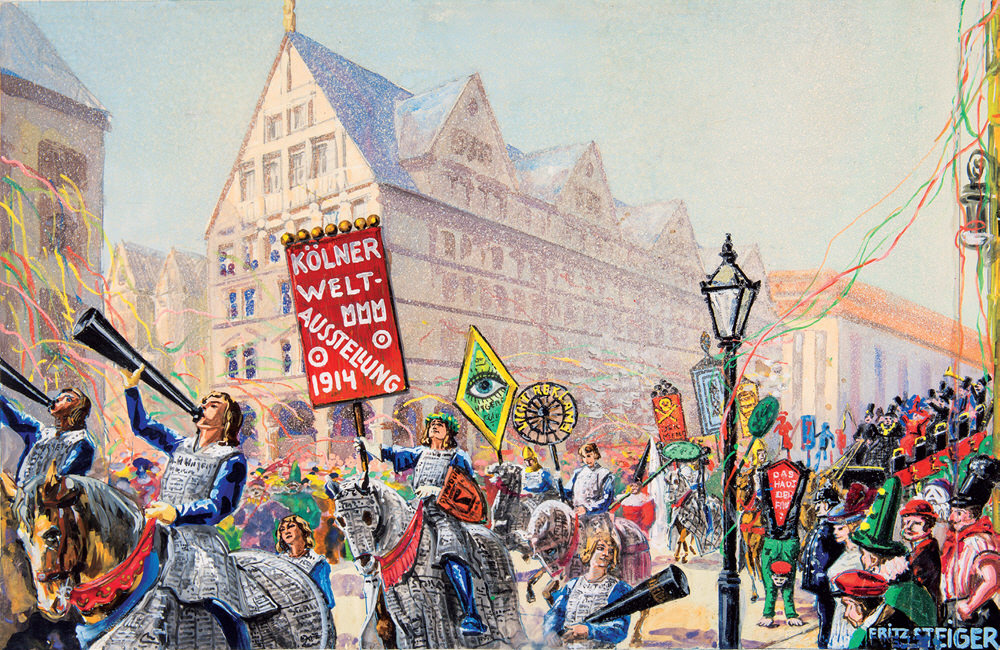 Doch trotz des „Säbelgerassels“ deutete Anfang Januar 1914 nichts darauf hin, dass ab August auch viele Kölner Karnevalisten „eine der ungeheuersten Erfahrungen der Weltgeschichte“ (Walter Benjamin) machen sollten.6 Im Gegenteil, Köln machte sich gerade auf, die „Metropole im Westen“ zu werden. Städtebaulich hatte man mit Straßendurchbrüchen in der Altstadt, verbunden mit dem neuen Architekturtyp großer Warenhäuser, Akzente gesetzt. Oper und Theater florierten. Aber auchim „Etablissement Simplicissimus“ und im „Café Palant“ auf der Hohestraße, im „Trocadero“ am Neumarkt oder in der „Apollo-Bar“ in der Schildergasse, überall pulsierte das Kölner Leben. Schon 1912 hatte die „Sonderbund- Ausstellung“ den Kölnern erstmals Werke von van Gogh, Cézanne, Gauguin oder Munch gezeigt, und nun stand ab dem 16. Mai 1914 die „Werkbund-Ausstellung“ vor der Tür, die einen vielfachen Aufbruch in die moderne Architektur bringen sollte. Aber das Ereignis am Deutzer Rheinufer gegenüber der historischen Altstadtsilhouette stand auch bis 1927 für das vorerst letzte Kölner Rosenmontagszugsmotto.