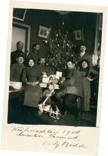 25 Am Beginn der vierjährigen Schlacht spricht noch Optimismus aus den Äußerungen. An der Westfront richtete sich der Blick gen Paris: „Immer Voran des Reiches Macht und Herrlichkeit.“26 Der Funk Max Kleesattel, im Zivilberuf Kaufmann, sandte den „bei Muttern gebliebenen Funken […] aus Feindesland“ Grüße. 27 Da wurde eine Karte mit einer französischen Kindertanzgruppe in rotweißen Kostümen spaßeshalber mit der Kommentierung „Umseitig die Jugendwehr der K.F.I.“ versehen, und Weihnachten 1914 bekamen die Eigentümer der requirierten Privatquartiere Geschenke – der Sohn der französischen Einwohner erhielt „Wägelchen und en Knabüs“ und ließ sich damit auch fotografieren.