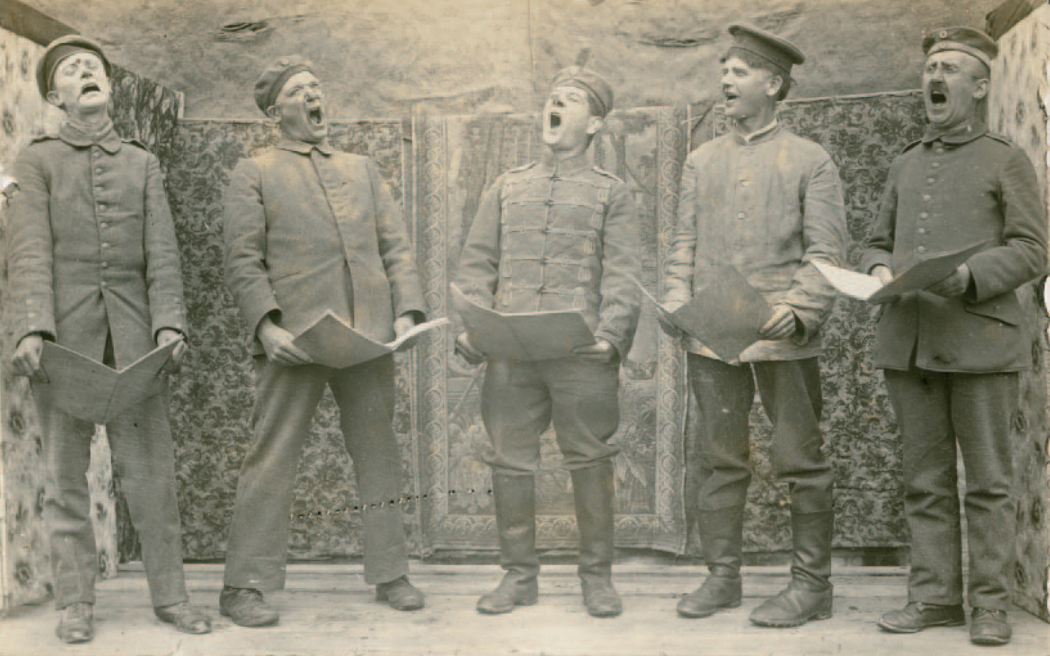 80 Da die Sehnsucht der Funken an der Front nach Karneval nicht erfüllt wurde, inszenierten sie im Schützengraben, in den Frontstellungen oder den Lazaretten ihren eigenen Karneval – sicher im Rahmen der minimalen Möglichkeiten, aber durchaus mit Sinn für Humor, der vom Kriegsalltag ablenkte. Der „Kölsche Fastelovend“ werde am westlichen Kriegsschauplatz nicht vergessen, versicherte ein dort stationierter Funk. 81 Das dokumentiert auch eine Postkarte mit einem Foto, das vier Soldaten beim Stippeföttche abbildet. 82 Zwei Funken sandten jeweils eine Ansichtskarte mit ihrem gemeinsamen Konterfei am Rosenmontagmittag und -abend. Die letztere zeigt beide mit heiterem Gesichtsausdruck, nach einigen „Trauerseidel Bier auf Köln“. 83 Da konnte der Funk Wilhelm Bodde hoffen, dass aus „diesem grausigen Krieg recht bald wieder unser lustiger Krieg tritt“. 84 Und einige Funken verkleideten sich sogar an der Front am Rosenmontag.