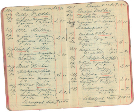 14Die Pakete packte und versandte wohl Schaufuß maßgeblich alleine, erst als er Ende 1916 für einige Wochen erkrankte, sprang Schatzmeister Clemens Breuer ein. Finanziert wurden die Liebesgaben teils aus der Kasse der Roten Funken, teils durch allgemeine Kriegssammlungen. In zwei erhaltenen Kassenbüchern aus der Zeit von September 1914, also unmittelbar nach Kriegsbeginn, bis März 1917 führte der Funkenpräsident penibel die Kosten für die einzelnen Pakete auf.