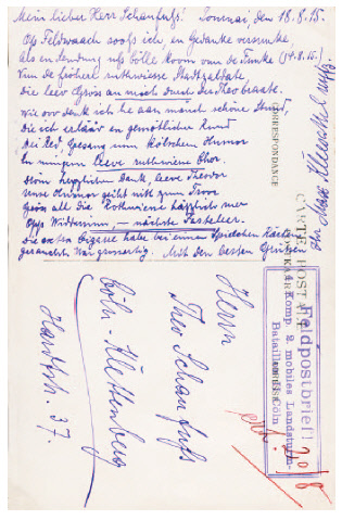 Aus Russland berichtete sein Funkenfreund Wilhelm Zäh, dass die „bismarckgeschmückte Pappemannsche Männer-Zigarre […] ganz verzüglich“ sei – Schaufuß solle einen größeren Vorrat anlegen, damit der Krieg nicht vor dem Bestand an Zigarren „bei unserem glorreichen Erfolgen im Osten“ zu Ende sei. Mancher Funk wunderte sich, woher der Präsident selbst in Zeiten der Warenknappheit in der Heimat die Zigarren besorgen konnte. 19 Die Pakete wurden zwar zeitig auf dem Postamt aufgegeben, aber aufgrund des ungeheuren Aufkommens vor den Weihnachtsfeiertagen blieben manche dennoch liegen. Der Vereinsdiener Johann Menzel erhielt sein Weihnachtspaket erst am 8. Februar 1915, und er dankte Schaufuß dafür, dass er nicht, wie seine Kameraden, ein durch beigelegte Äpfel verdorbenes Paket erhielt. 20 Für diese Liebesgabenpakete dankten die Funken ihrem Präsidenten mit Nachrichten von der Front – auf Postkarten, wie es sich Schaufuß wünschte, damit er Erinnerungsalben anlegen konnte. Die Funken fühlten sich angespornt, ihren Beitrag für das „Kriegsalbum“ zu leisten. 21 Mancher schrieb sogar, dass er mit den Karten „zur Vervollständigung des Archiv[s] d[er] K.F.I. [Kölner Funken-Infanterie]“ beitragen wolle. 22 Einige der Absender dichteten auch für ihren Präsidenten: