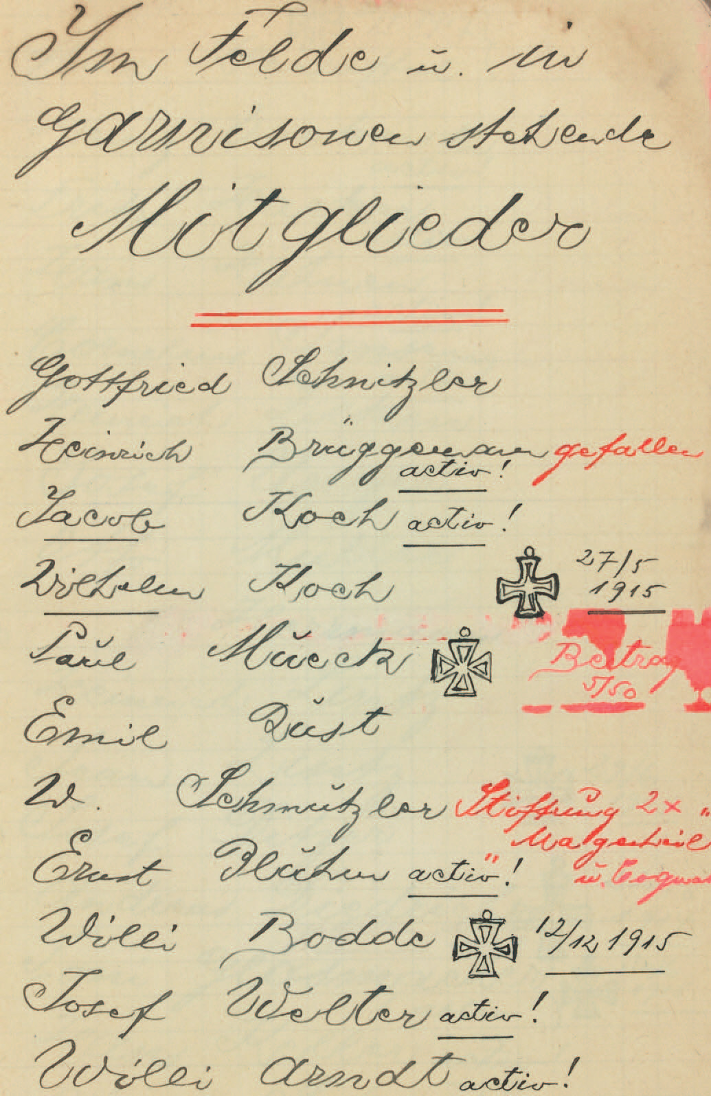 15 So erhielt z. B. Jean Haubrich am 23. Februar 1915 ein Paket mit Zigarren, Zigaretten, Zigarillos und Schokolade. Zu Weihnachten wurden besondere Pakete gepackt, die die Stimmung an der Front mit Tannengrün heben sollten. Die Flasche mit alkoholischem Getränk verschaffte einem Soldaten eine fröhliche Silvesterfeier – amnächsten Tag hatte er „sogar einen kleinen Brummschädel – ungewohnte Genüsse“. 16 Vollständig sind die Ausgaben für das Jahr 1915 dokumentiert. Schaufuß versandte ca. 325 Pakete – also fast täglich eines – an 51 im Feld stehende Rote Funken sowie die beiden Vereinsdiener, das heißt pro Soldat sechs Pakete im Jahr oder alle zwei Monate eines.